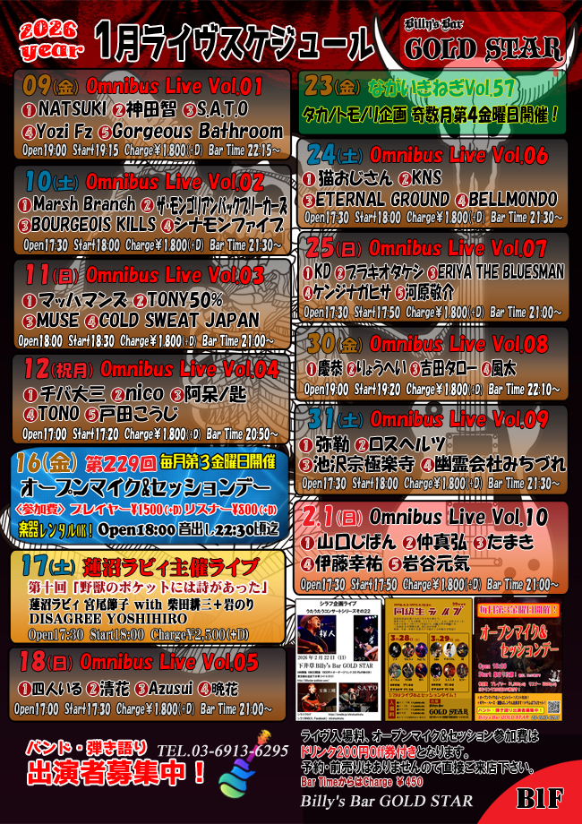 | 2/01 | Sun | 2026 year Omnibus Live Vol.10 【出演】 ①山口じばん ②仲真弘 ③たまき ④伊藤幸祐 ⑤岩谷元気 ■Open17:30 ■Start17:50 ■Charge¥2,200(+D) ※ドリンク200円Off券付 ■Bar Time 21:00~ ![]() |