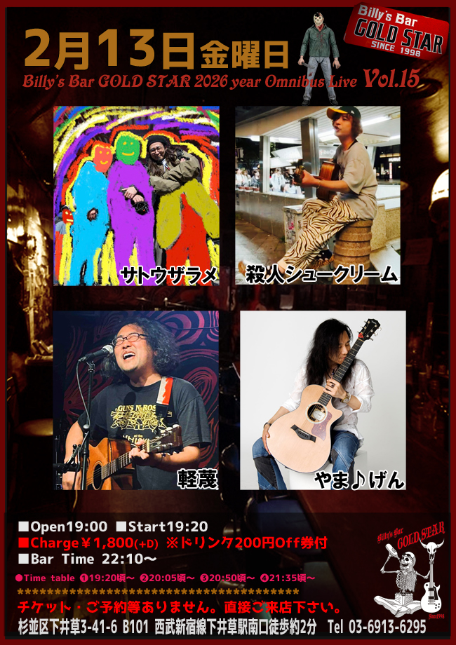 | 13 | Fri | 2026 year Omnibus Live Vol.15 【出演】 ①サトウザラメ ②殺人シュークリーム ③軽蔑 ④やま♪げん ■Open19:00 ■Start19:20 ■Charge¥1,800(+D) ※ドリンク200円Off券付 ■Bar Time 22:10~ ![]() |