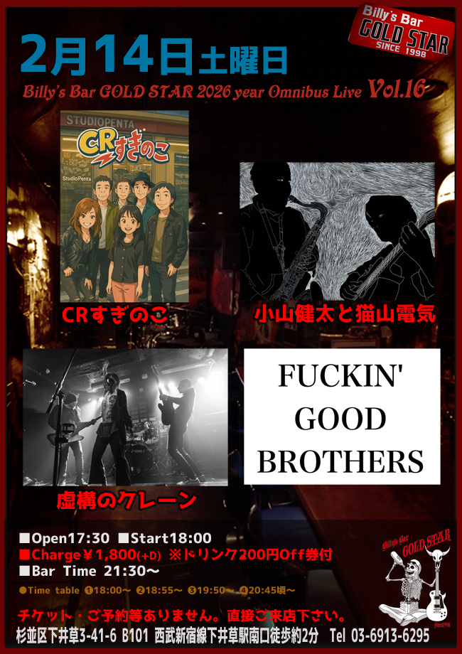 | 14 | Sat | 2026 year Omnibus Live Vol.16 【出演】 ①CRすぎのこ ②小山健太と猫山電気 ③虚構のクレーン ④FUCKIN' GOOD BROTHERS ■Open17:30 ■Start18:00 ■Charge¥1,800(+D) ※ドリンク200円Off券付 ■Bar Time 21:30~ ![]() |
