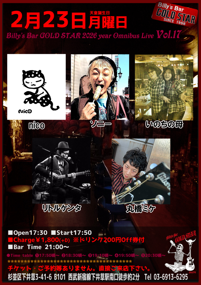 | 23 | Mon | 2026 year Omnibus Live Vol.17 【出演】 ①nico ②ソニー ③いのちの母 ④リトルケンタ ⑤丸橋ミケ ■Open17:30 ■Start17:50 ■Charge¥1,800(+D) ※ドリンク200円Off券付 ■Bar Time 21:00~ ![]() |