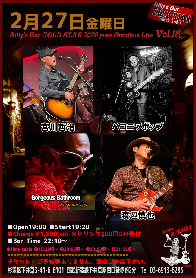 | 27 | Fri | 2025 year Omnibus Live Vol.18 【出演】 ①宮川哲治 ②ハコニワポップ ③Gorgeous Bathroom ④渡辺慎也 ■Open19:00 ■Start19:20 ■Charge¥1,800(+D) ※ドリンク200円Off券付 ■Bar Time 22:10~ ![]() |