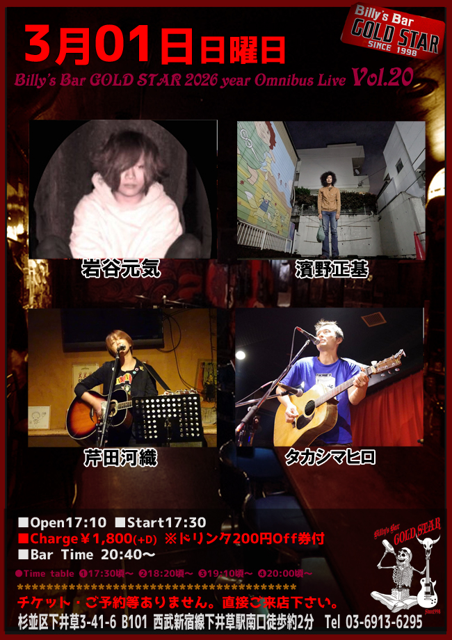 | 3/1 | Sun | 2026 year Omnibus Live Vol.20 【出演】 ①岩谷元気 ②濱野正基 ③芹田河織 ④タカシマヒロ ■Open17:10 ■Start17:30 ■Charge¥1,800(+D) ※ドリンク200円Off券付 ■Bar Time 20:40~ ![]() |