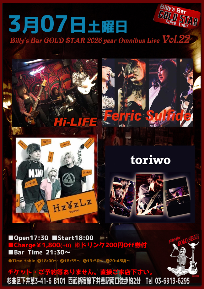 | 07 | Sat | 2026 year Omnibus Live Vol.22 【出演】 ①Hi-LIFE ②Ferric Sulfide ③Hz¥zLz ④toriwo ■Open17:30 ■Start18:00 ■Charge¥1,800(+D) ※ドリンク200円Off券付 ■Bar Time 21:30~ ![]() |