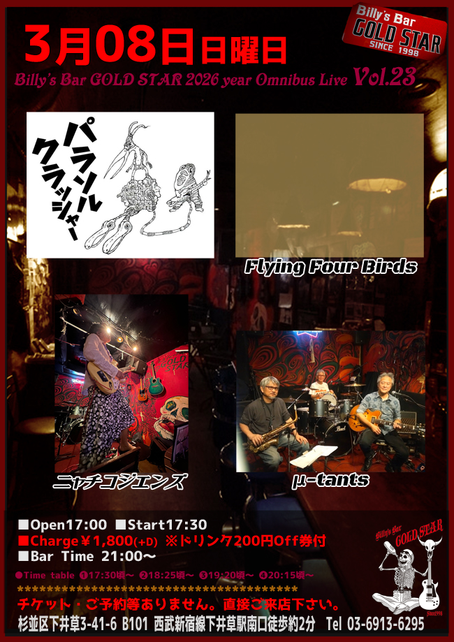 | 08 | Sun | 2026 year Omnibus Live Vol.23 【出演】 ①パラソルクラッシャー ②Flying Four Birds ③ニャチコジエンズ ④μ-tants ■Open17:00 ■Start17:30 ■Charge¥1,800(+D) ※ドリンク200円Off券付 ■Bar Time 21:00~ ![]() |