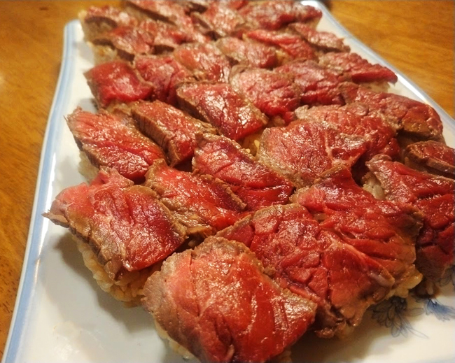 ローストビーフを漬けタレにくぐらせ、 赤酢のシャリで握ります!