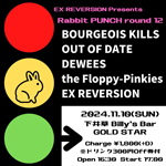 | 11/10 | Sun | EX REVERSION presents 『RABBIT PUNCH round 12』 @ 下井草 Billy‘s Bar GOLD STAR 【出演】 ①EX REVERSION ②BOURGEOIS KILLS ③Out of date ④DEWEES ⑤the Floppy Pinkies ■Open16:30 ■Start17:00 ■Charge ¥1,800(+D) ※ドリンク300円Off券付! ■Bar Time 20:30~ ![]() |