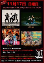 | 11/17 | Sun | 2024 year Omnibus Live Vol.96 【出演】 ①猫おじさん ②Heap ③Azu+ ④Bouncing Duck ■Open17:40 ■Start18:00 ■Charge ¥1,800(+D) ※ドリンク300円Off券付! ■Bar Time 21:15~ |