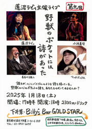 第九回「野獣のポケットには詩があった」 誰もが心にバイブルのような詩を持っている。 野獣の心のポケットの詩を、あなたものぞいてみませんか? 【出演】 ①マッチボックス ②長谷川雄二 ③小池真司 ④蓮沼ラビィ ■Open17:30 ■Start18:00 ■Charge¥2,300(+D) ※ドリンク300円off券付 ■Bar Time 21:40~ |