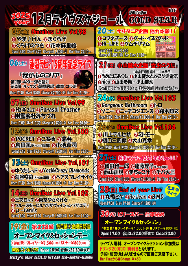 | 12 | Fri | 2025 year Omnibus Live Vol.100 【出演】 ①POCKET ②こねる ③愚弁 ④島田篤(From京都) ⑤小池真司 ■Open18:45 ■Start19:10 ■Charge¥1,800(+D) ※ドリンク200円Off券付 ■Bar Time 22:10~ ![]() |