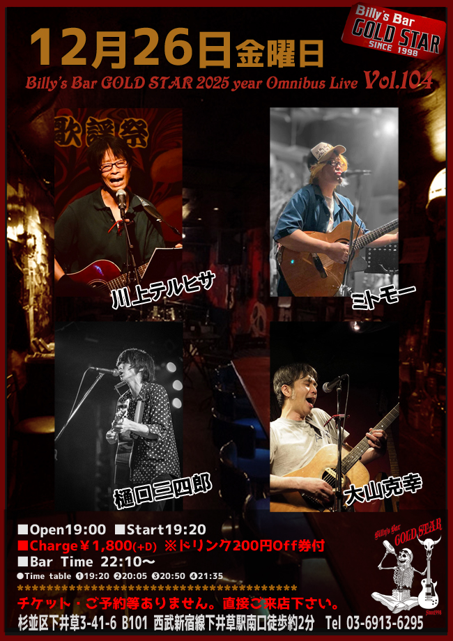 | 26 | Fri | 2025 year Omnibus Live Vol.104 【出演】 ①川上テルヒサ ②ミトモー ③樋口三四郎 ④大山克幸 ■Open19:00 ■Start19:20 ■Charge¥1,800(+D) ※ドリンク200円Off券付 ■Bar Time 22:10~ ![]() |