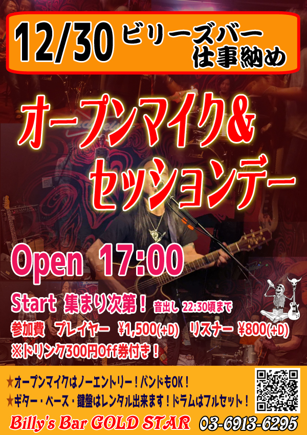 | 30 | Tue | ビリーズバー仕事納め 第229回 rオープンマイク&セッションデー <参加費> ●プレイヤー¥1,500(+D) ●リスナー¥800(+D) ※ドリンク200円Off券付! ■Open17:00 ■音出し22:00頃まで ★詳細はコチラ ![]() |