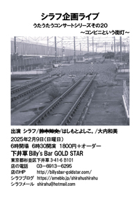 | 2/9 | Sun | シラフ企画ライブ うたうたうコンサートシリーズその20 ~コンビニという街灯~ 【出演】 ①大内和美 ②はしもとよしこ。 ●鈴木知文(※出演キャンセル) ③シラフ ■Open18:00 ■Start18:30 ■Charge¥1,800(+D) ※ドリンク300円off券付 ■Bar Time 20:30~ ![]() |