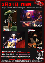 | 2/24 | Mon | 2025 year Omnibus Live Vol.20 【出演】 ①nico ②miho ③タカシマヒロ ④清花 ■Open17:30 ■Start17:50 ■Charge¥1,800(+D) ※ドリンク300円Off券付 ■Bar Time 20:45~ ![]() |