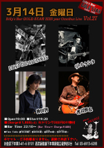 | 3/20 | Thu | 『春の骨肉歌謡祭』 【出演】 ①POCKET ②ボンクラナイズドオーケストラ ③雑's(from岩手) ④骨肉ビール ■Open18:30 ■Start19:00 ■Charge¥2,800(+D) ※ドリンク300円Off券付 ■Bar Time 22:00~ ![]() チバ大三企画 |