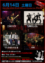| 6/14 | Sat | 2025 year Omnibus Live Vol.52 【出演】 ①三文ロック ②猫おじさん ③りとるばいりとる ④KNS ■Open17:30 ■Start17:50 ■Charge¥1,800(+D) ※ドリンク200円Off券付 ■Bar Time 21:30~ ![]() |