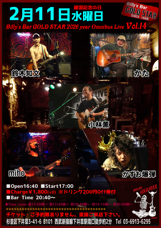 | 11 | Wed | 2026 year Omnibus Live Vol.14 【出演】 ①鈴木知文 ②かた ③小林薫 ④miho ⑤かずお爆弾 ■Open16:40 ■Start17:00 ■Charge¥1,800(+D) ※ドリンク200円Off券付 ■Bar Time 20:40~ ![]() |