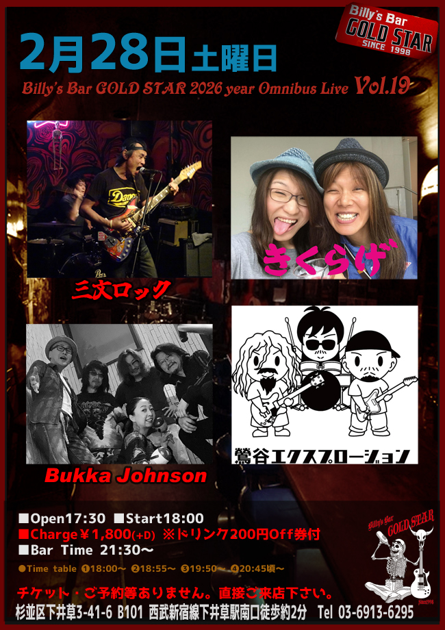 | 28 | Sat | 2025 year Omnibus Live Vol.19 【出演】 ①三文ロック ②きくらげ ③Bukka Johnson ④鶯谷エクスプロージョン ■Open17:30 ■Start18:00 ■Charge¥1,800(+D) ※ドリンク200円Off券付 ■Bar Time 21:30~ ![]() |