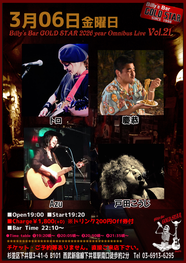 | 06 | Fri | 2026 year Omnibus Live Vol.21 【出演】 ①トロ ②慶恭 ③Azu ④戸田こうじ ■Open19:00 ■Start19:20 ■Charge¥1,800(+D) ※ドリンク200円Off券付 ■Bar Time 22:10~ ![]() |